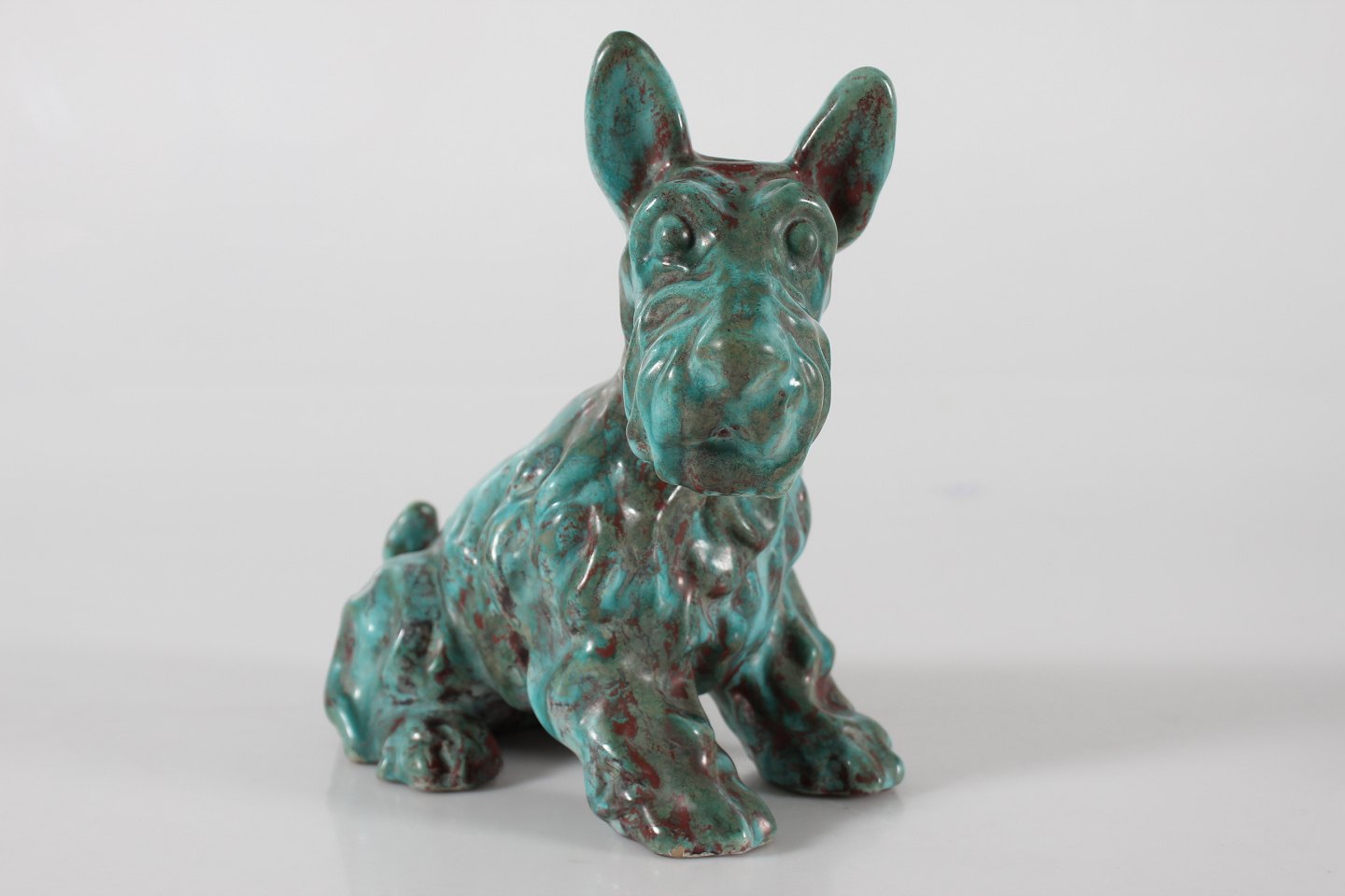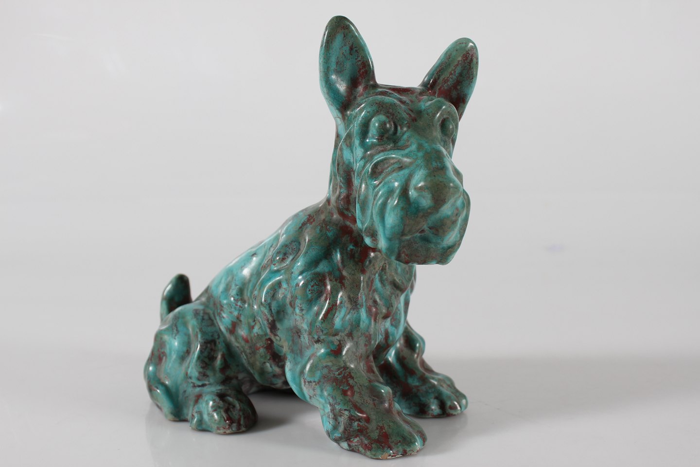 Michael Andersens Keramikfabrik - Bornholm Stor skotsk terrier af keramik dekoreret med turkis lustreglasur Længde 26 cm Højde 12 cm Med logo fra Michael Andersen Fin stand uden skår, revner eller rep.