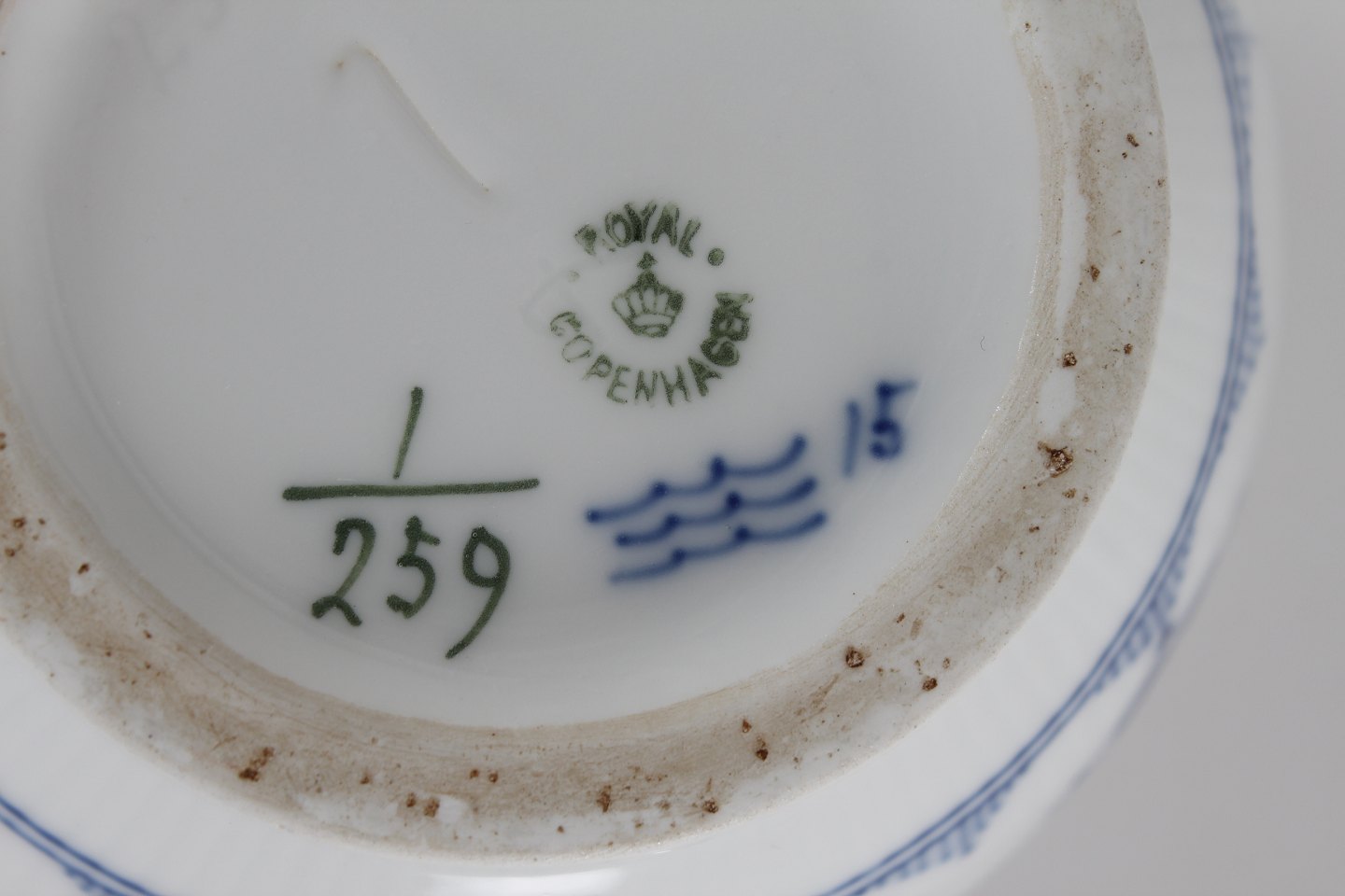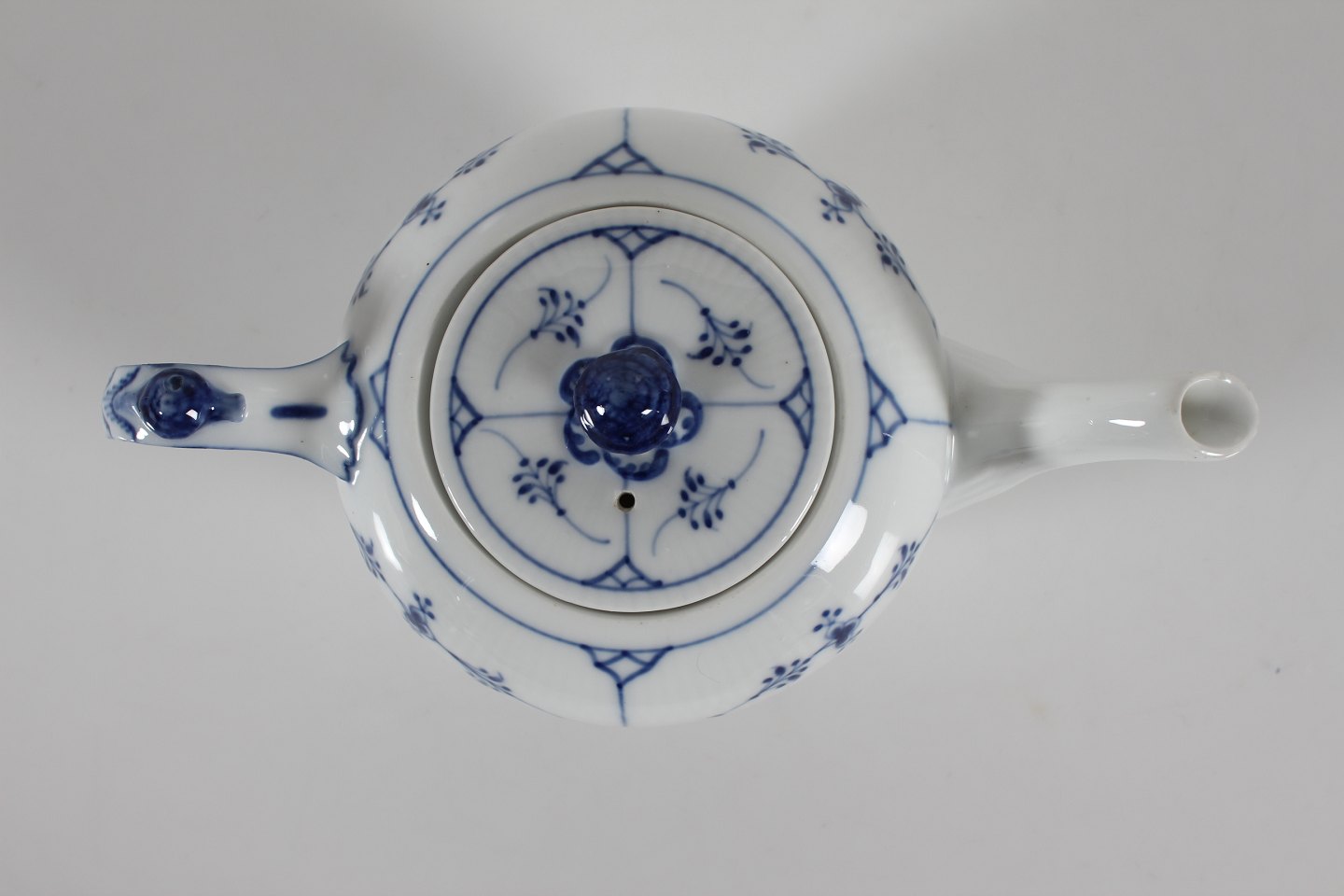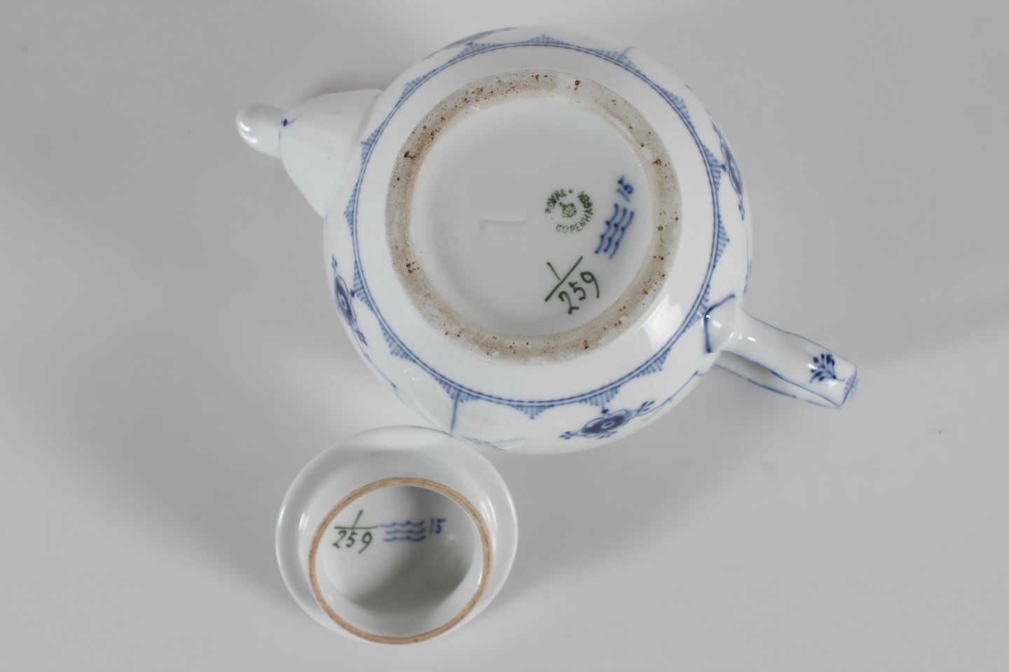 Royal Copenhagen Musselmalet Riflet Thekande model 1/259 Med stempel fra perioden 1894-1922 Højde 15 cm Indeholder: 1 L Fin fejlfri 1. sortering