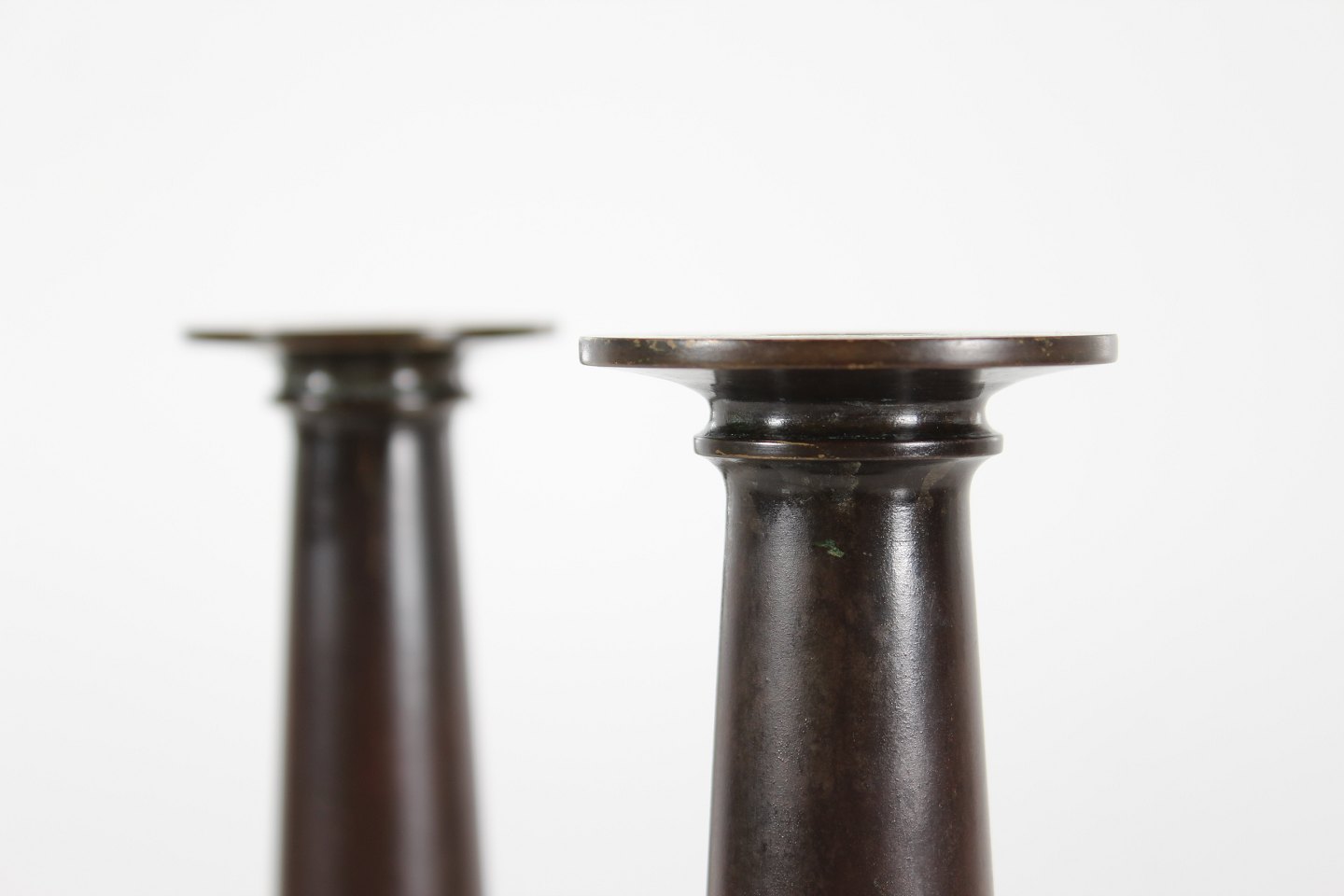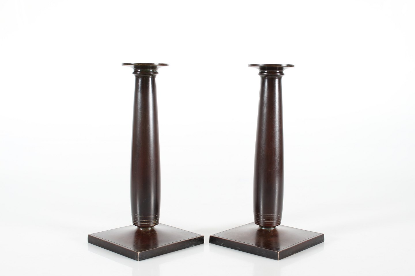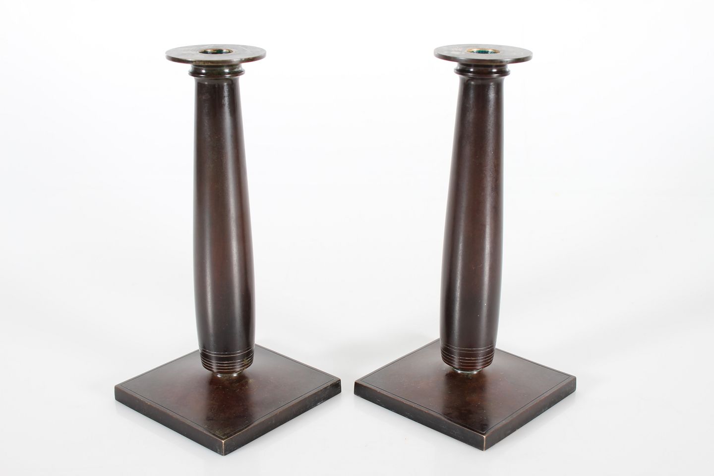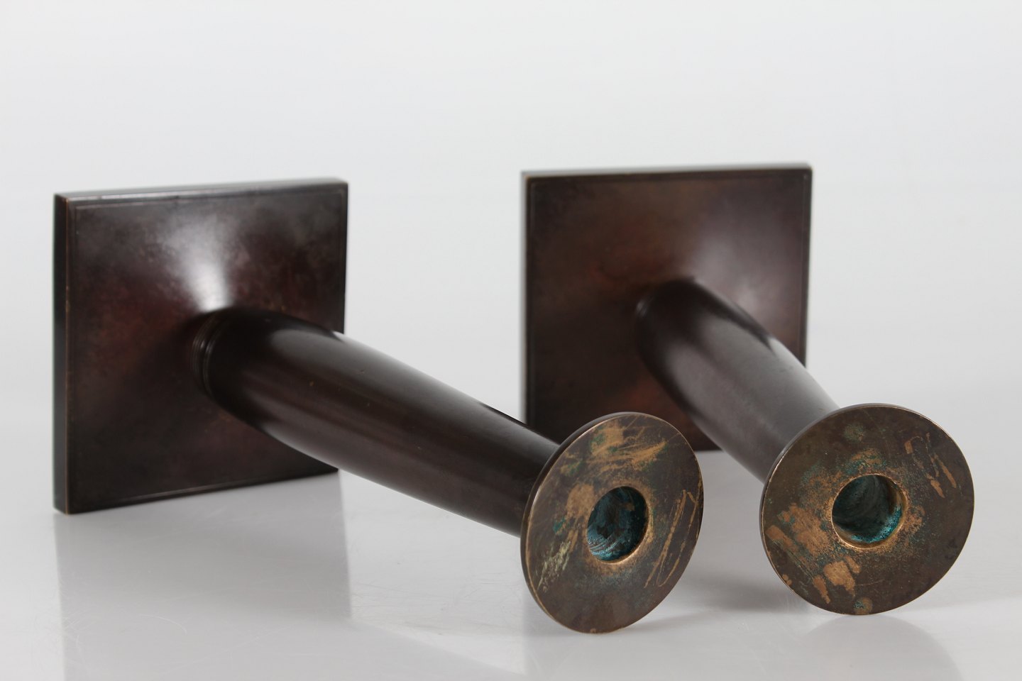 Just Andersen - Danmark Par lysestager af bronze med mørk patina model B 155 Stemplet: Just A - Denmark + model B 155 Højde 25 cm Længde x bredde basis: 11,5 x 11,5 cm Fin stand efter alm. brug med en smule brugsspor