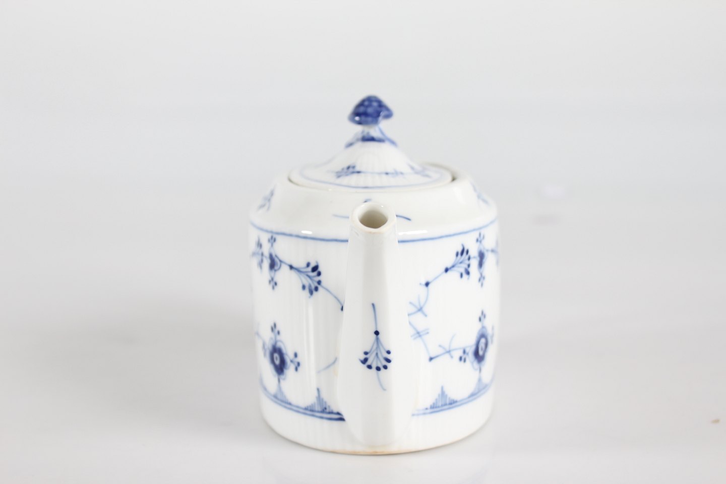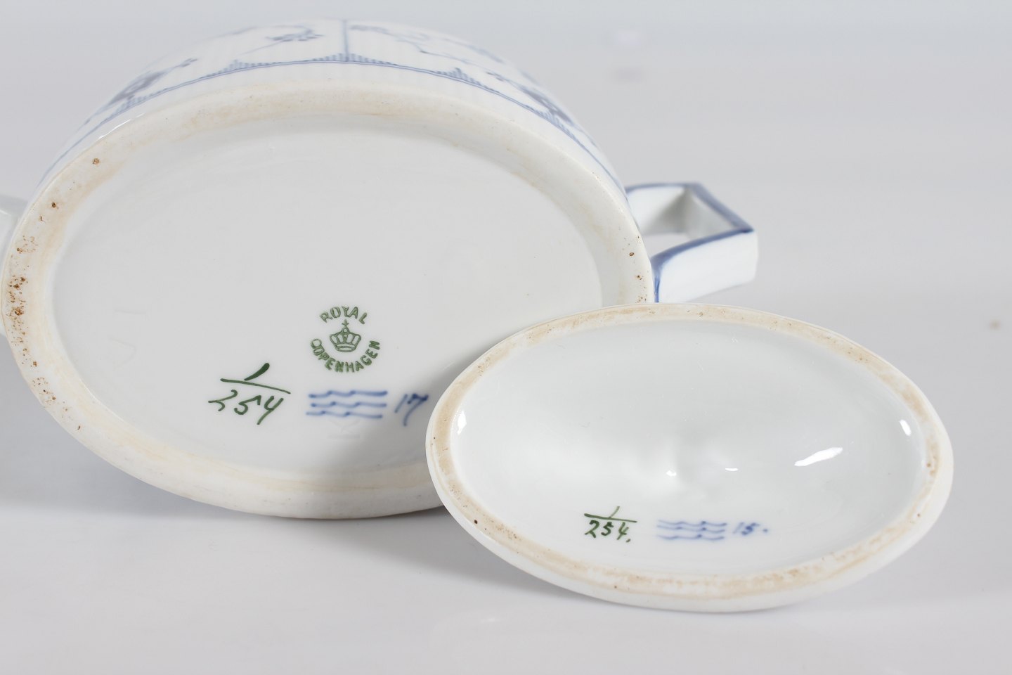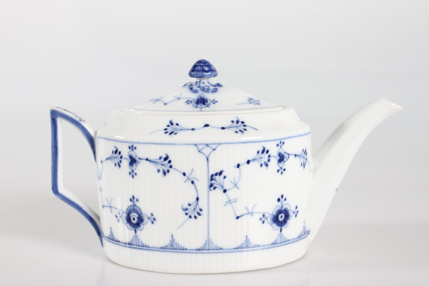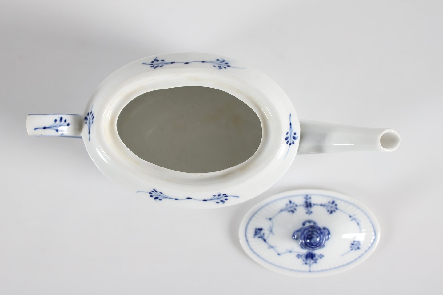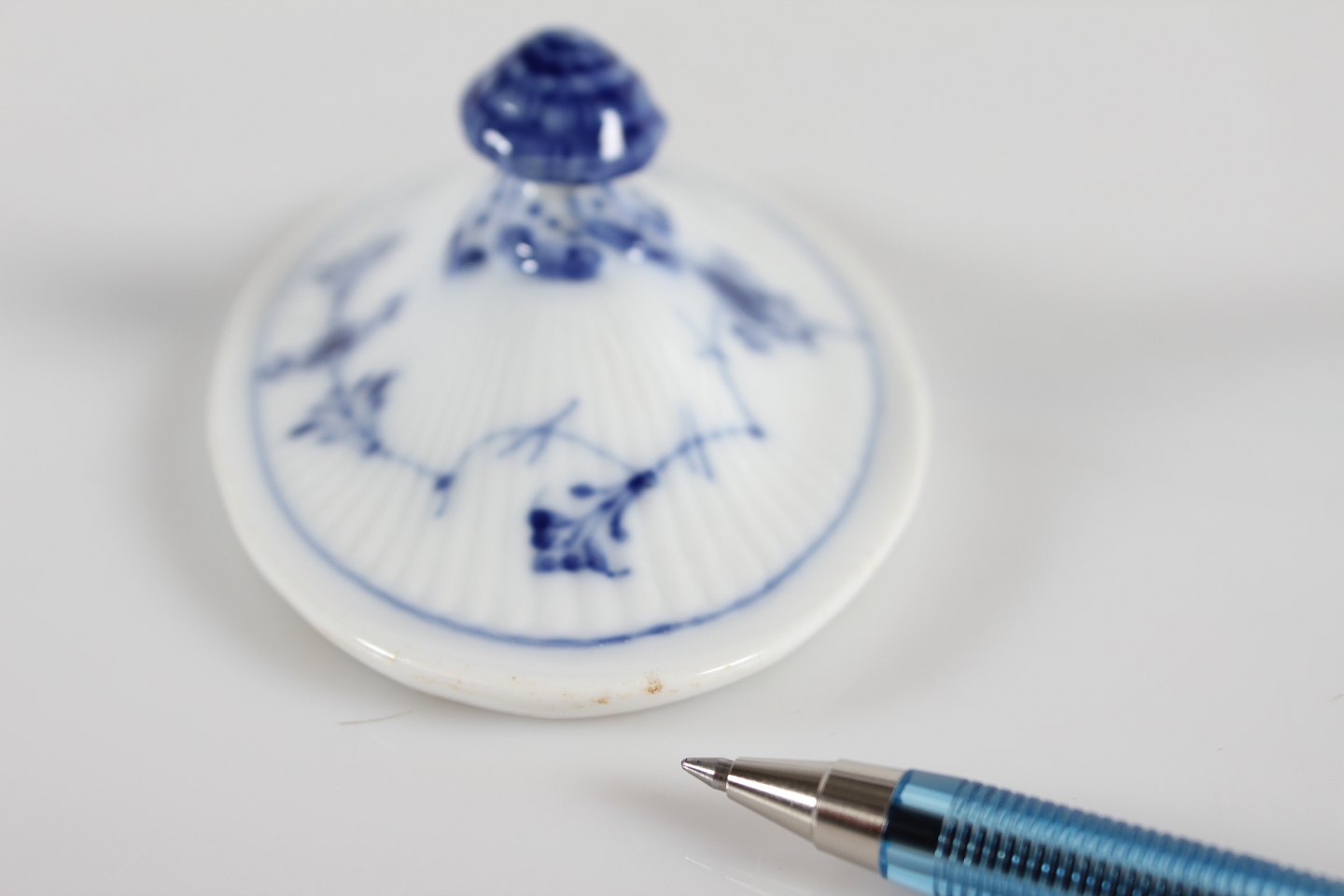 Royal Copenhagen Musselmalet Riflet Antik aflang thekande model 1/254 Med stempel fra perioden 1894-1922 Længde 23 cm Højde 12,5 cm Indeholder: 0,6 L 1. sortering - se billede af lille uregelmæssighed på kanten af låget