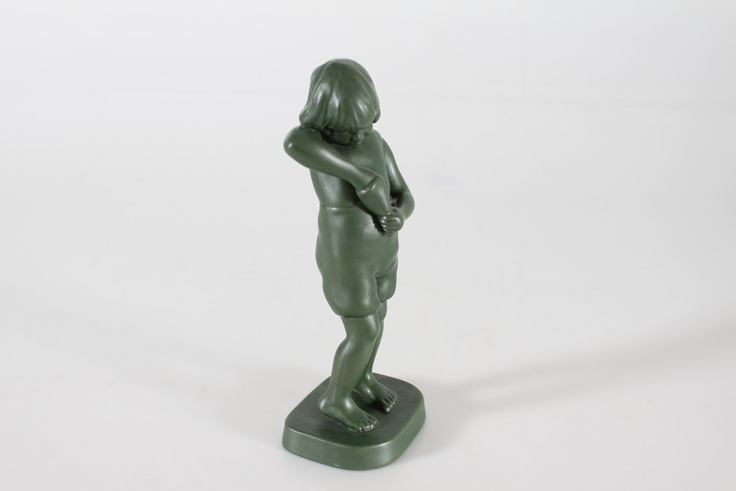 P. Ipsens Enke Figur af dreng med kræmmerhus nr. 899 formgjort af Michaela Karsten (1886-1943) Fremstillet af keramik m/jadegrøn glasur Højde 22,5 cm Fin stand med ganske lille revne i basen