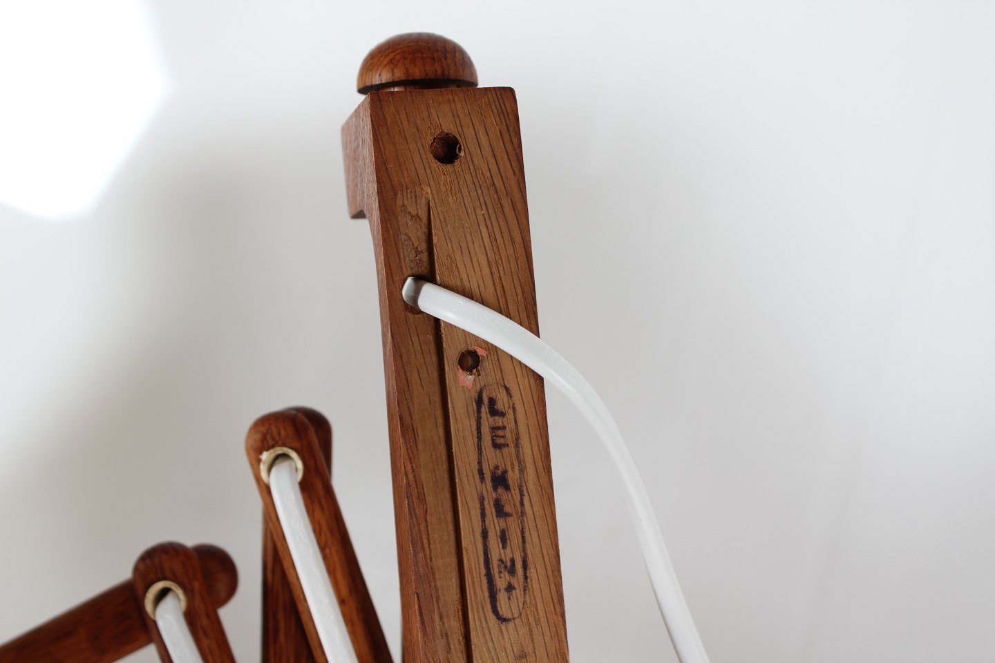 Erik Hansen og Le Klint Saxlampe model 224 af patineret egetræ med original Le Klint skærm Højde med skærm 35 cm Skærm diameter 30 cm Fin funktionsdygtig stand medfølgende original skærm med enkelte knæk