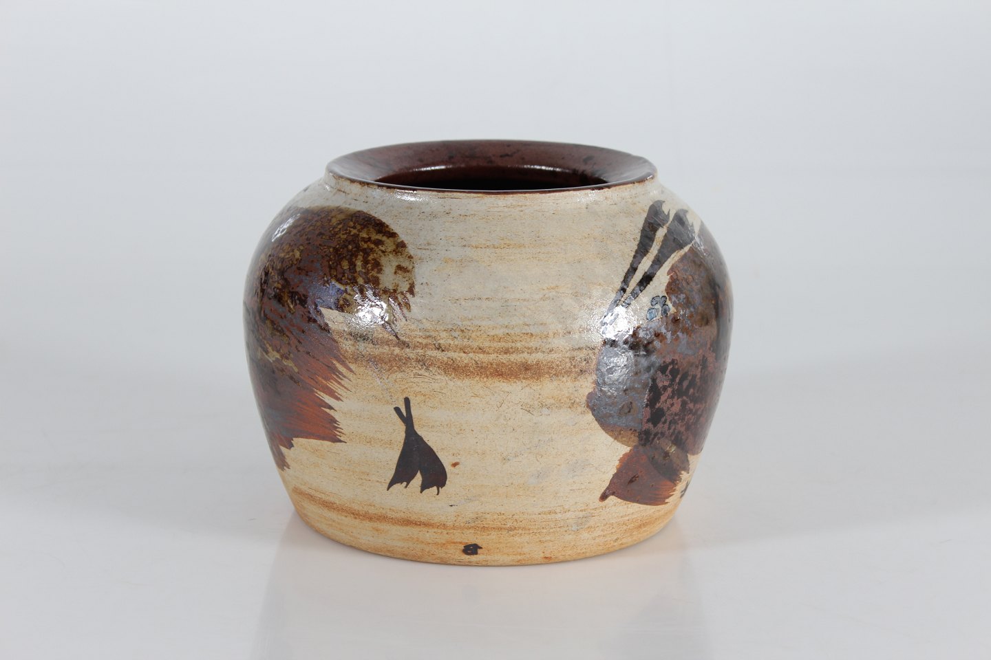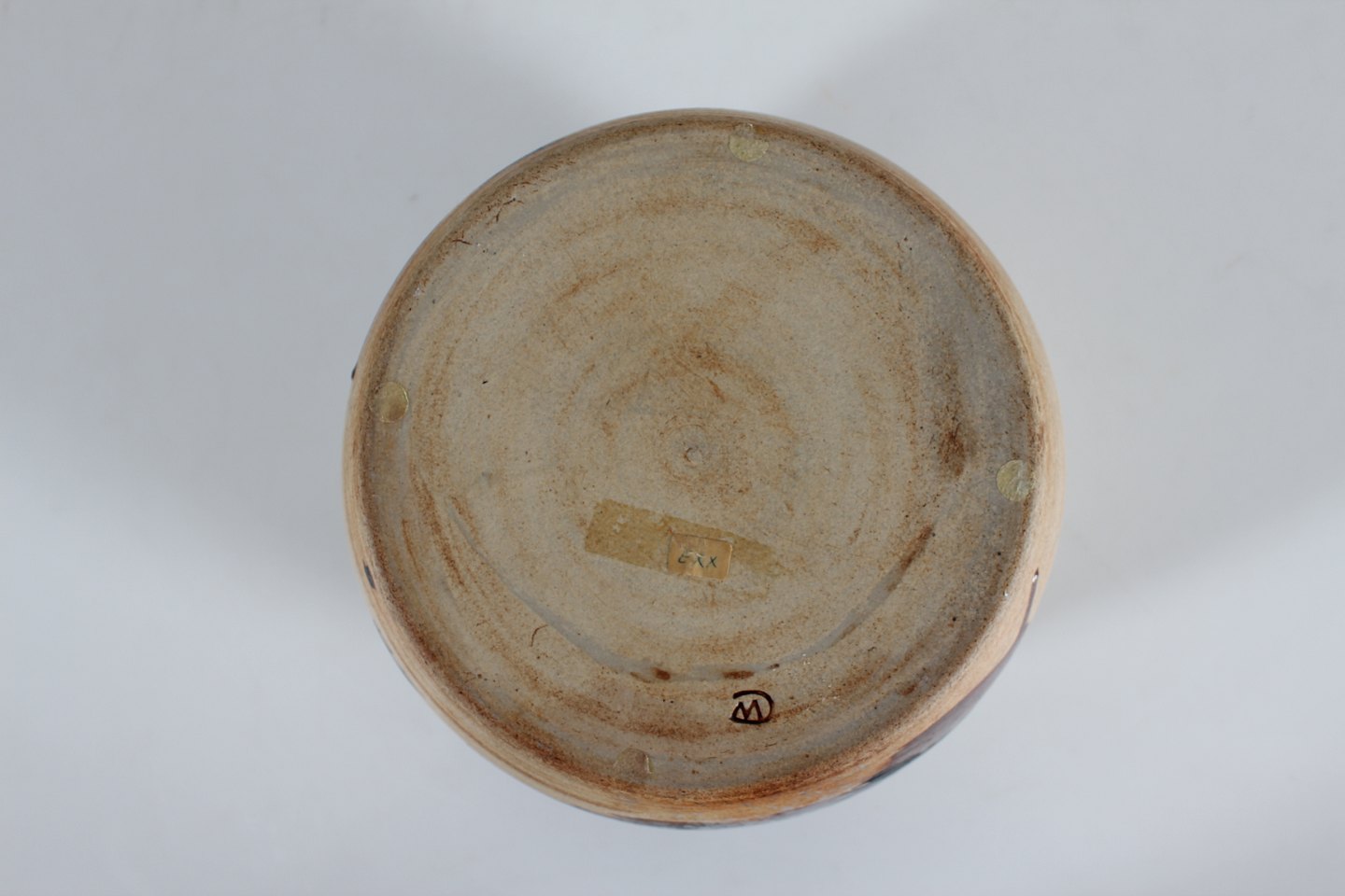 Conny Walther Stor bred krukke af stentøj med abstrakt glasurdekoration Sign. monogram for Conny Walther fra hendes eget værksted Diameter 23 cm Højde 17,5 cm Fin stand uden skår eller rep.