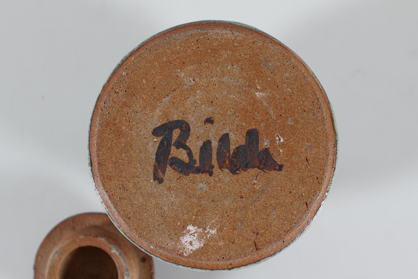 Gunver Bilde (1931-2018) Lågkrukke af stentøj i rustik stil dekoreret med blå-brune nuancer Sign. Bilde Højde 10 cm Diameter 11 cm Fin fejlfri stand