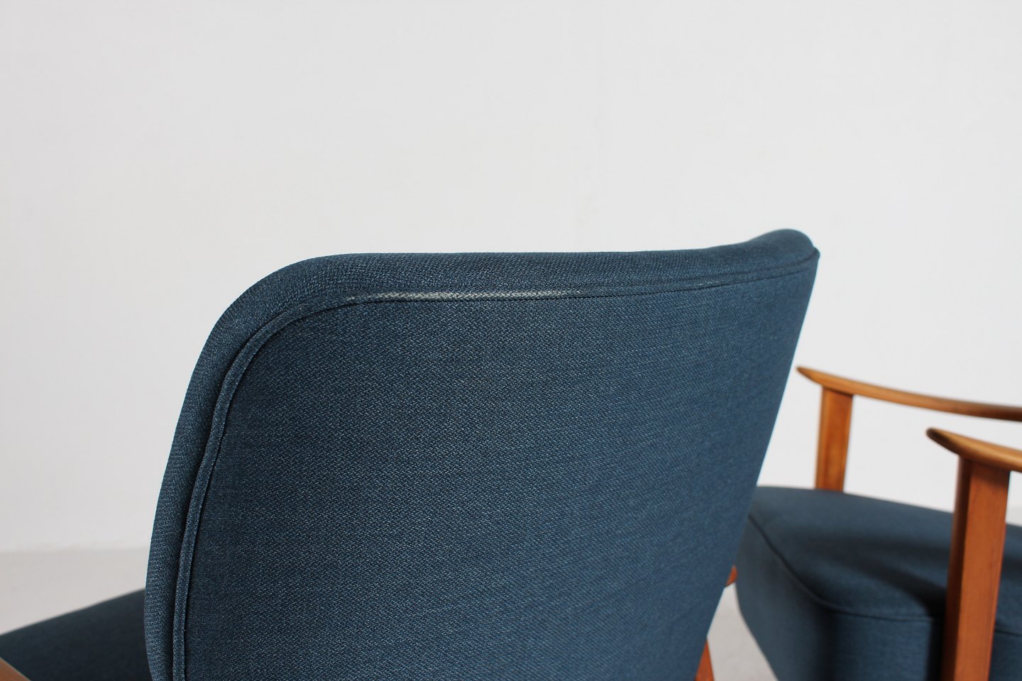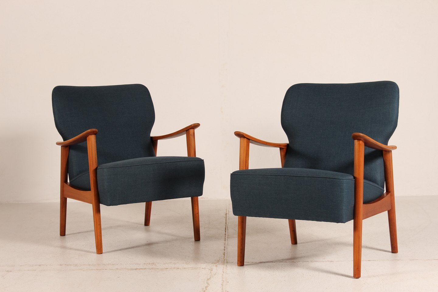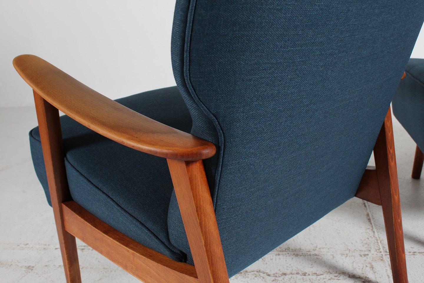 Fritz Hansen A/S Par lænestole af teak farvet bøg betrukket med blåt betræk. Producent: Fritz Hansen A/S Mål: Højde 83/46 cm Bredde 66 cm Dybde 82 cm Fin stand med nyere betræk og god fasthed
