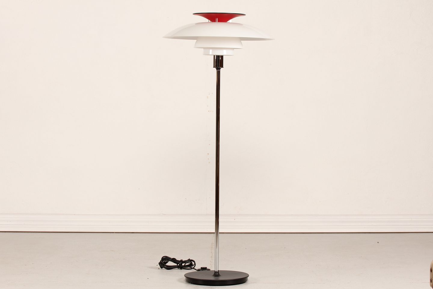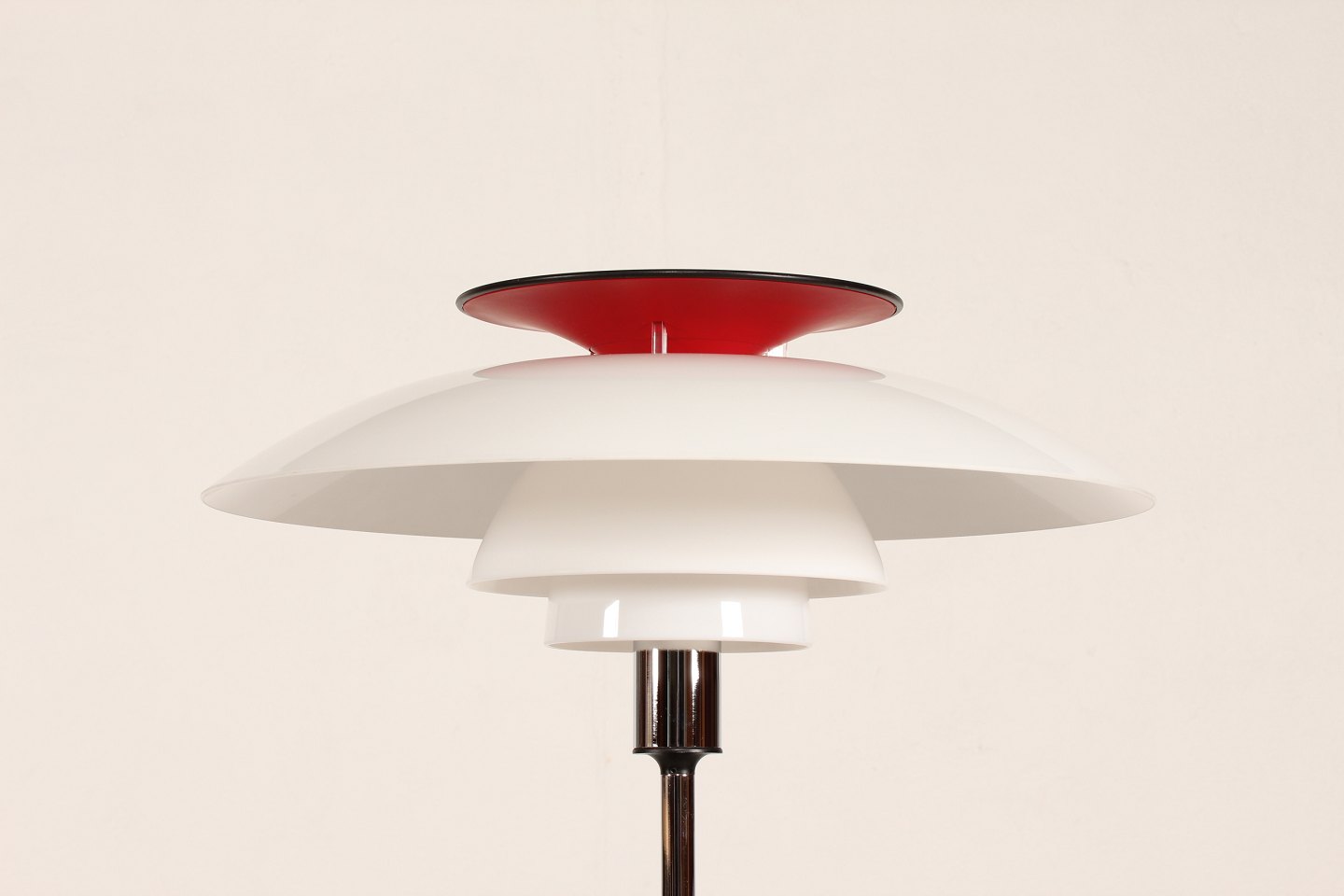Poul Henningsen (1894-1967) Standerlampe model PH 80 fremstillet af kunststof og metal Producent: Louis Poulsen A/S Højde 132 cm Skærm diameter 55 cm Fin funktionsdygtig stand Lampen kan beses efter aftale