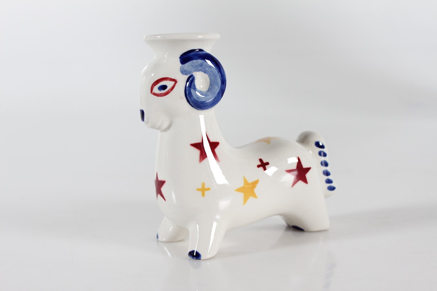 Aluminia Julebuk Julebuk i fajance udformet som lysestage med blå ring tegnet af Kaj Lange til julen 1941 Længde 10 cm Højde 10 cm Fin fejlfri stand, en smule krakelering kan forekomme