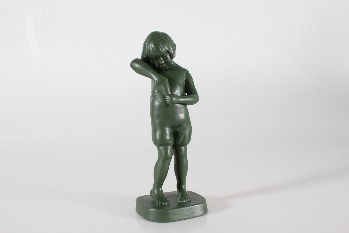P. Ipsens Enke Figur af dreng med kræmmerhus nr. 899 formgjort af Michaela Karsten (1886-1943) Fremstillet af keramik m/jadegrøn glasur Højde 22,5 cm Fin stand med ganske lille revne i basen