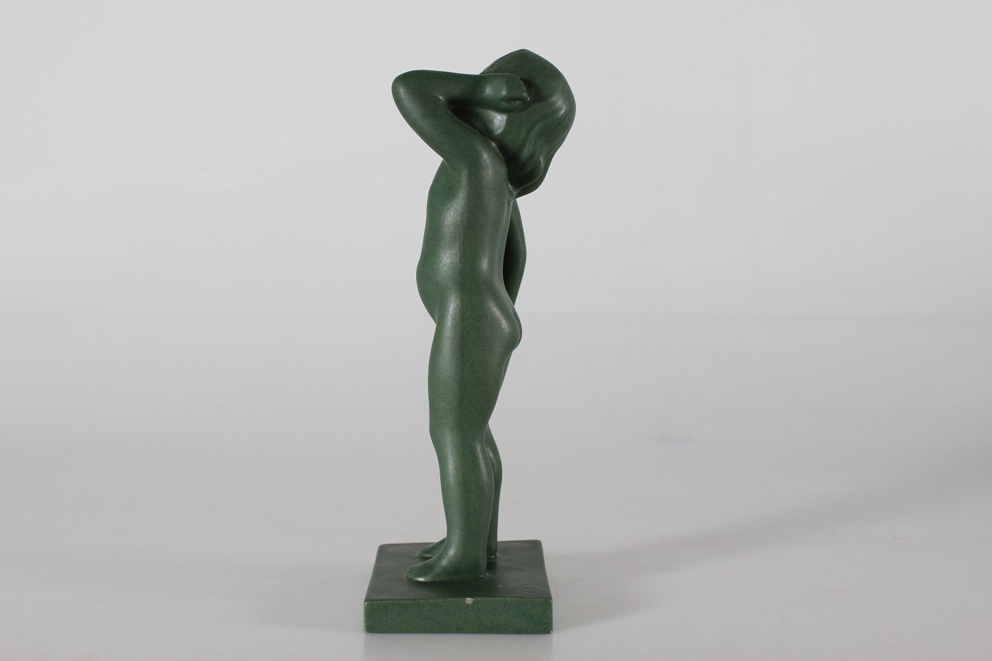 Ipsens Enke Figur "Morgengry/Opvågnen" nr. 916 formgjort af Arne Bang Fremstillet i keramik dekoreret med jadegrøn glasur Højde 22 cm Fin stand - se foto af få ganske små afslag