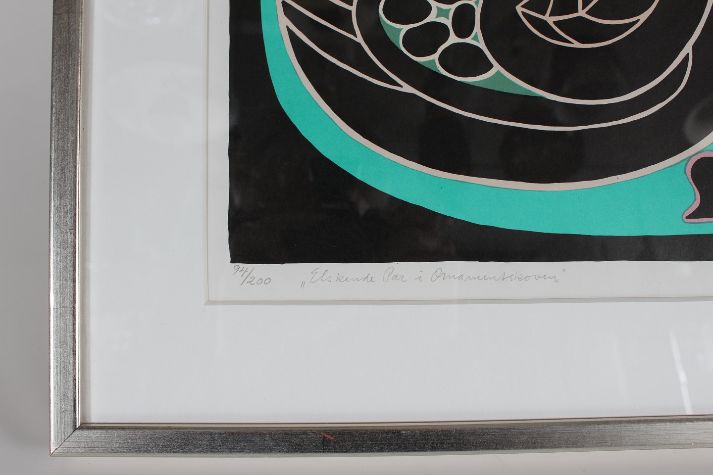 Henry Heerup (1907-1993) "Elskende par i Ornamentskoven" Litografi 94/200 Mål incl. passepartout og ramme 66 x 60 cm Sign. Heerup Indrammet i sølvramme i træ Fin stand Billedet kan beses efter aftale