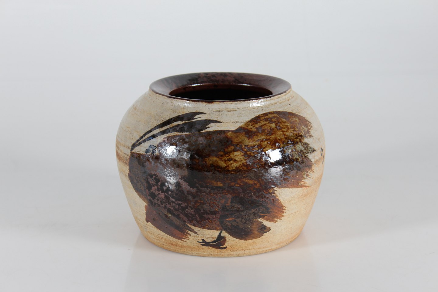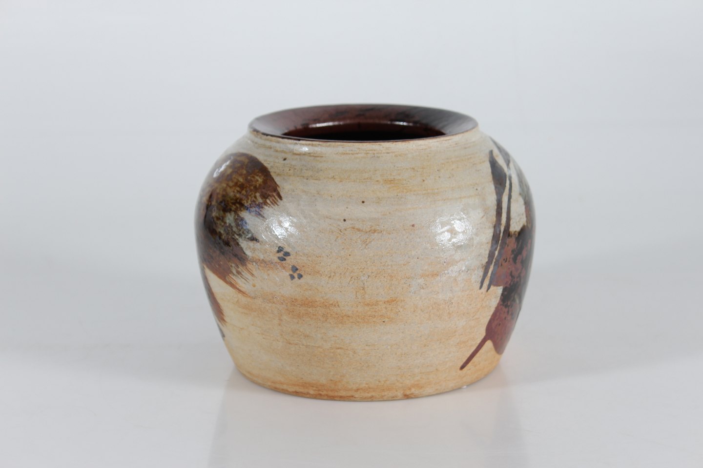 Conny Walther Stor bred krukke af stentøj med abstrakt glasurdekoration Sign. monogram for Conny Walther fra hendes eget værksted Diameter 23 cm Højde 17,5 cm Fin stand uden skår eller rep.