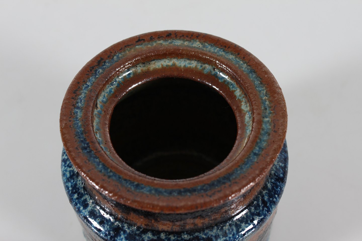 Gunver Bilde (1931-2018) Lågkrukke af stentøj i rustik stil dekoreret med blå-brune nuancer Sign. Bilde Højde 10 cm Diameter 11 cm Fin fejlfri stand