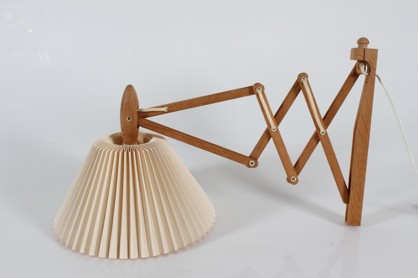 Erik Hansen og Le Klint Saxlampe op model 223 af egetræ med original Le Klint skærm Højde med skærm 40 cm Længde 40-75 cm Skærm diameter 30 cm Fin funktionsdygtig stand m/original skærm i pæn stand med patina