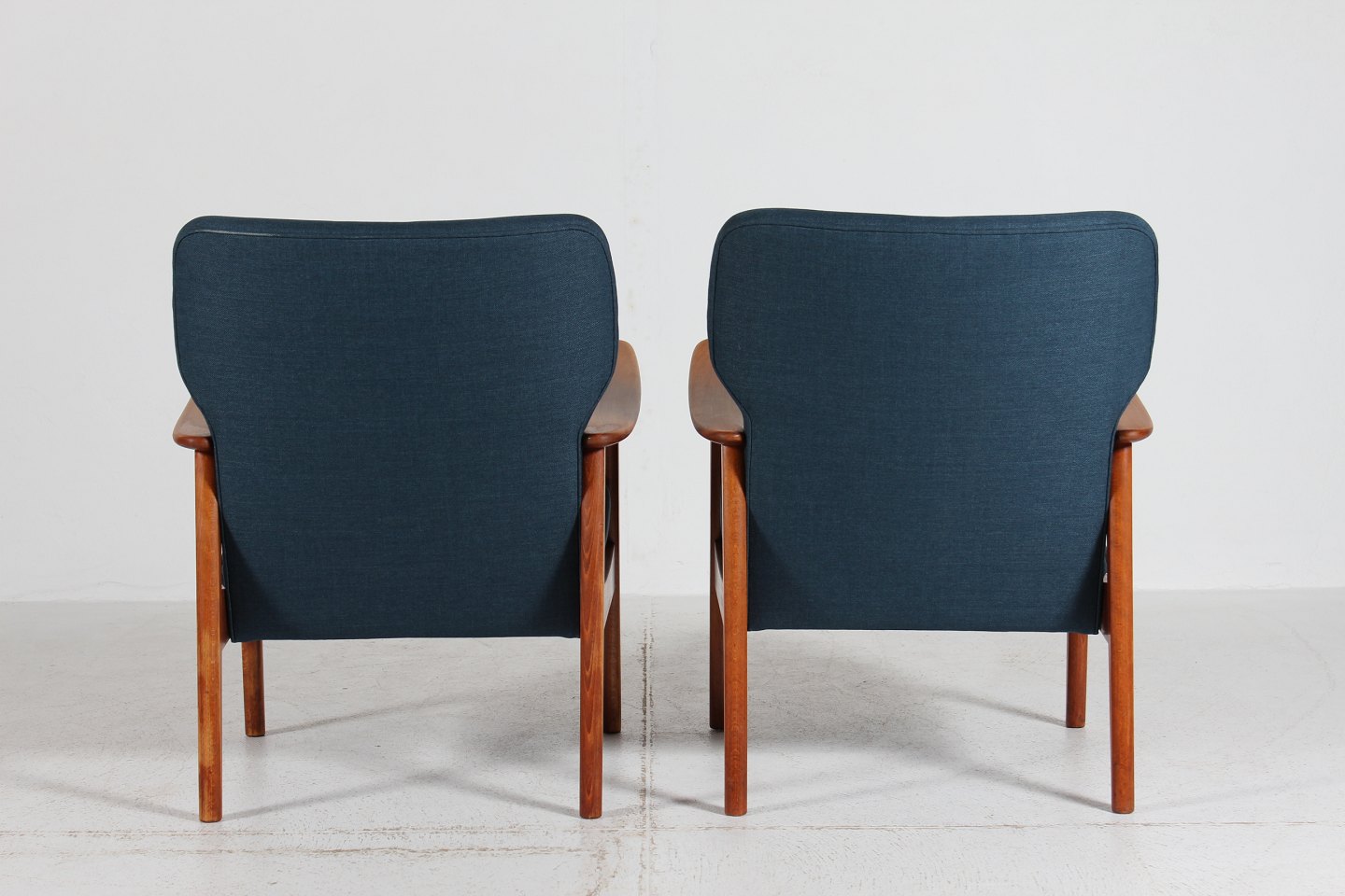 Fritz Hansen A/S Par lænestole af teak farvet bøg betrukket med blåt betræk. Producent: Fritz Hansen A/S Mål: Højde 83/46 cm Bredde 66 cm Dybde 82 cm Fin stand med nyere betræk og god fasthed